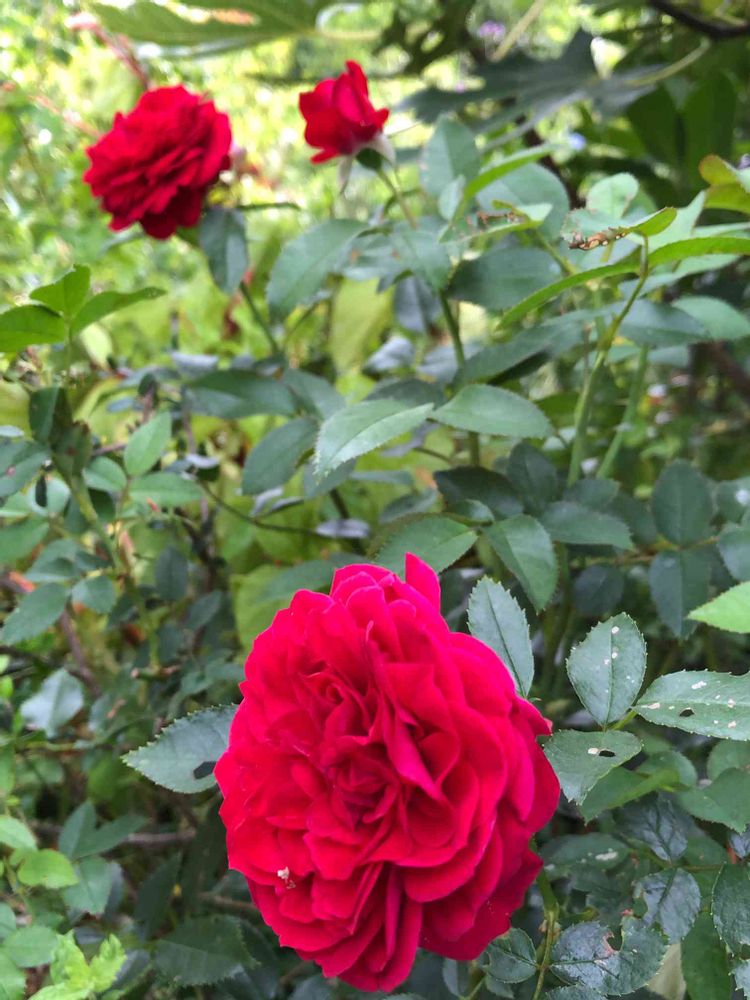 庭の草花の間に入れ込んでみた🌹トゥルーブルーム レッドキャプテン♥️♥️♥️