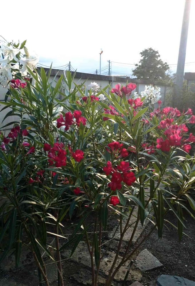 赤いキョウチクトウ、綺麗ですね😍後ろの百合が白いから紅白でめでたいですよね🇯🇵🥇🎉🎊🥎