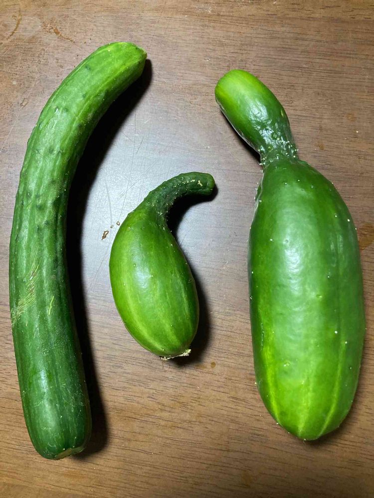 真ん中と右がわが家で収穫したキュウリ!大きさがわかるように、スーパーで買ったキュウリが左です。プランターで普通に育てているのに、かなり個性的に自己主張しているわが家のキュウリ!日当たりも水も不足してないのに、なぜナスのようになってしまうのか?味はどうか?こんど食べてみます!