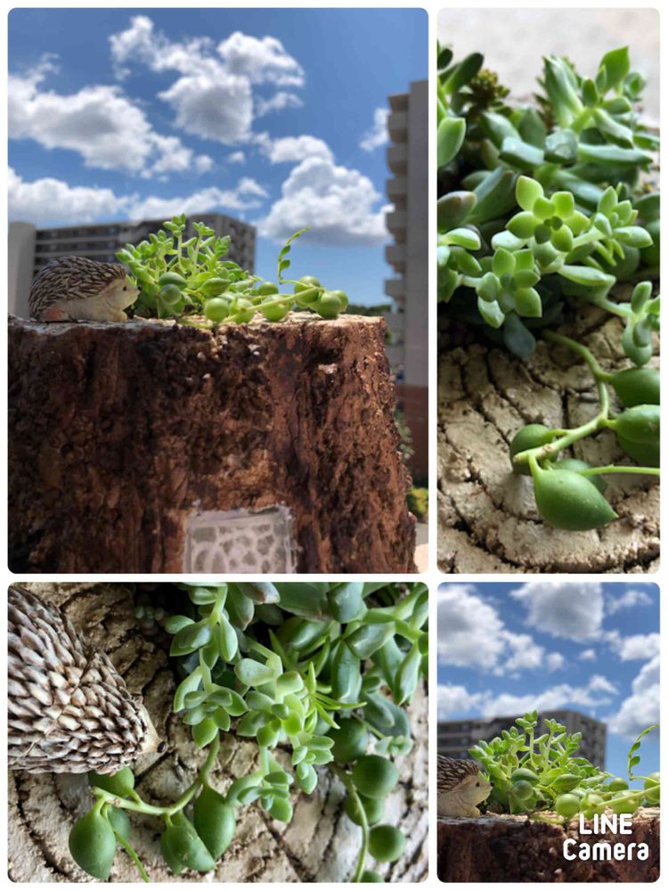 多肉さんとはりねずみさんはお友達ですね。仲良しさんたちが夏の空に包まれて幸せそうでございます。