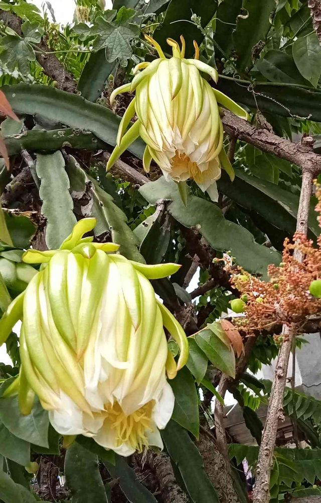 家の塀づたいにドラゴンフルーツを植えて成長したドラゴンフルーツで生垣みたいになっているお宅をよく見かけます