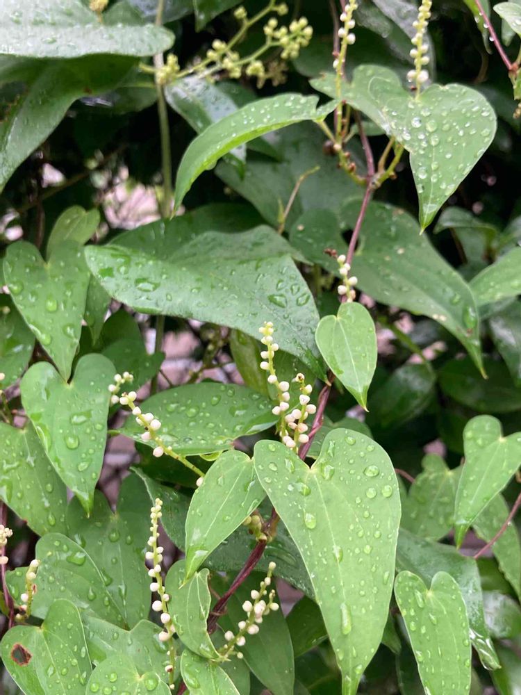 ☔️降って涼しい朝。ヤマノイモの雄花が近所の生垣に絡みついてます。朝散歩より