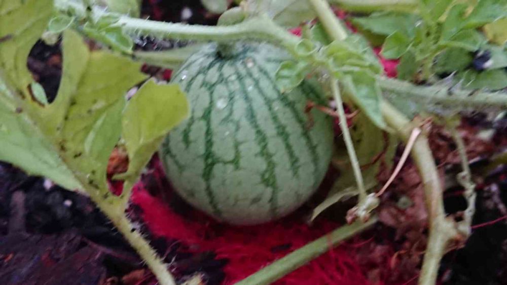 スイカの苗を買って植えたままにしておいたらこんなに小さなスイカがなってた😅