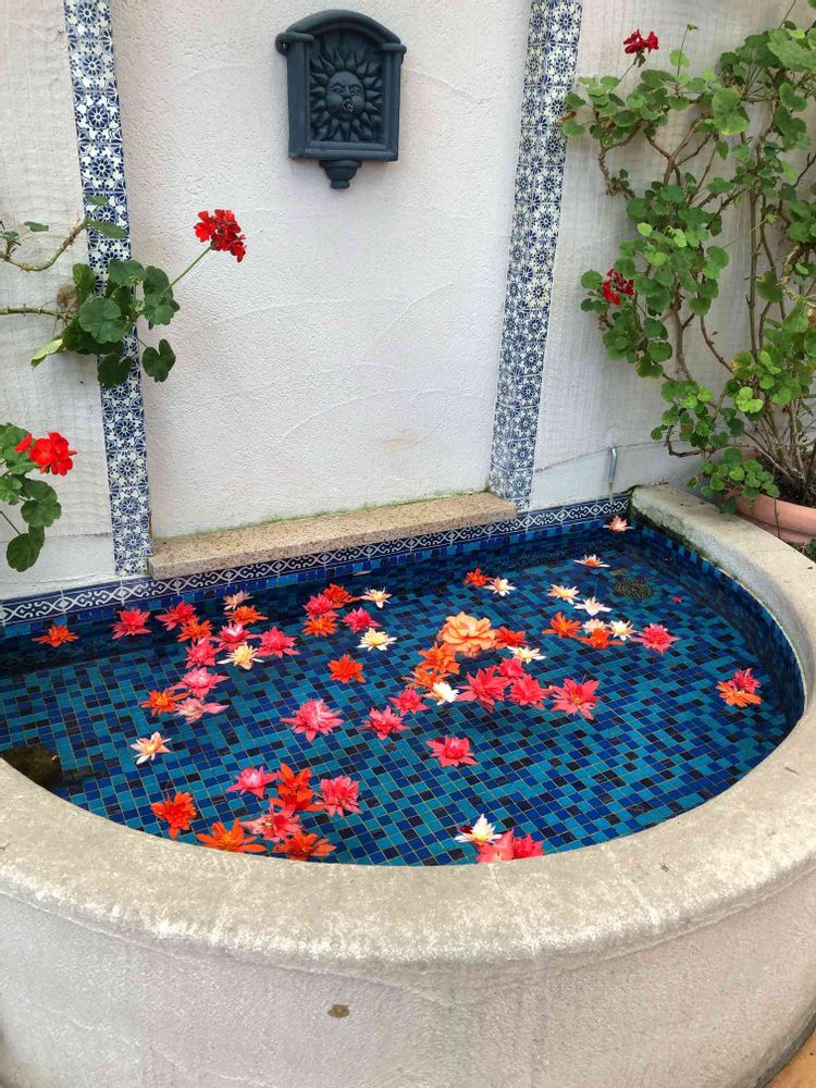 青いタイルの水盤に鮮やかな色のお花が浮かべてありました🌸