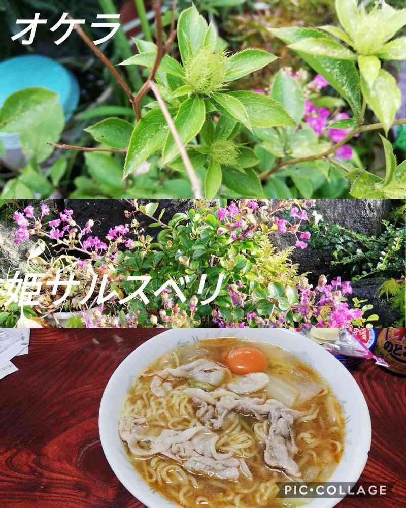 オケラの蕾 やはり名前の通り 目立たない😅姫サルスベリ そろそろ終わりかな そして 一人暮らしのおじさんの 遅い昼食 ビールを飲むと どうしてもラーメンが食べたくなってしまう🤭