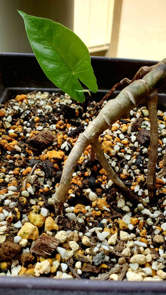 モンステラ鉢から何やら出てきたから何かと思ったら、つるっぱげになってダメ元で植えたブラックステムだった😍😍😍