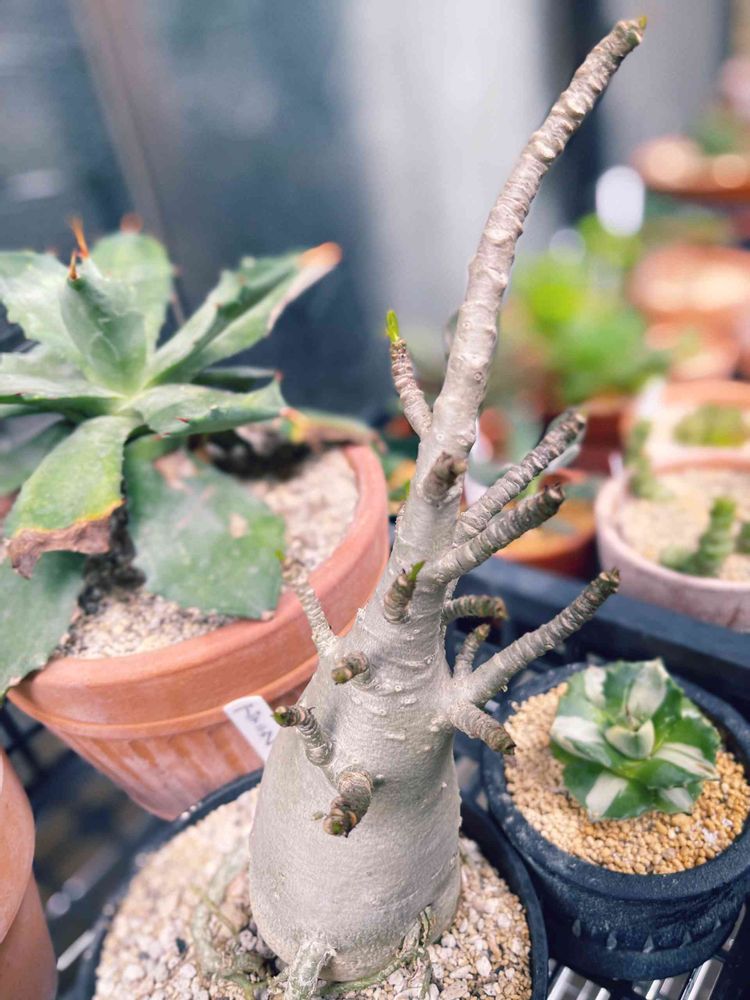 裸ん坊になったアデニウムアラビカムのアランですが、葉っぱが出てきました!