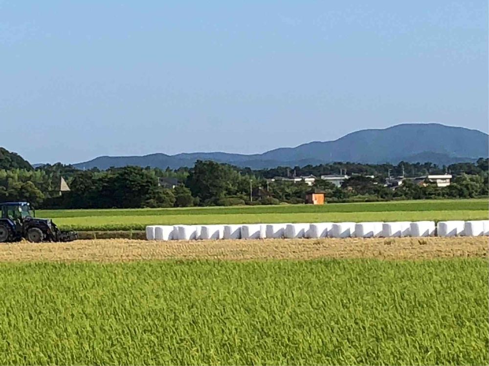 白いのは、ロールベールラップサイロと言って、刈り取った稲や稲藁を筒状にし、表面をラップすることで雨風から守り、徐々に発酵がすすみ、長期間牛の🐂🐄飼料として使うことが出来る‼️ラシイ