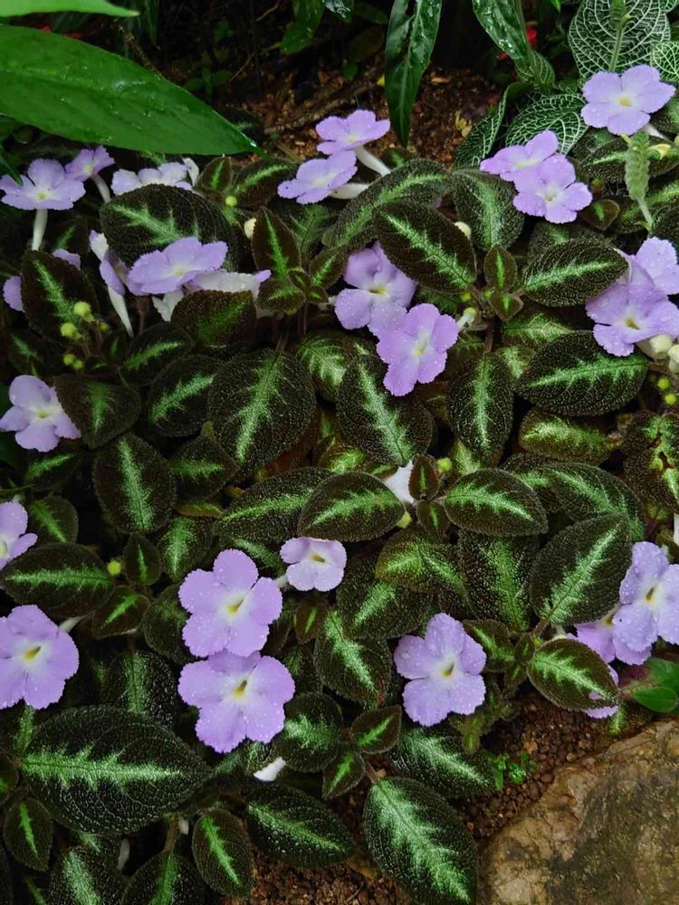 絵の具で描いたような葉っぱはカラテアですね。お花はルエリアかしら?
