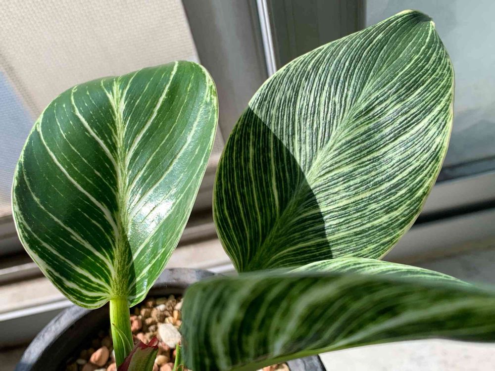 左の新しい葉が緑色多いからか、線が少ないからかテカテカしとる