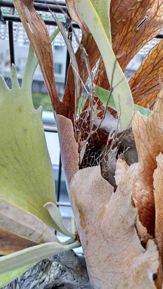 ビカクシダさんの貯水葉が太い葉脈に成って行ってるんですよね~例年は流木の表面を持って行くだけやったのに…犯人はアシナガバチ~巣を作る素材として今年はビカクシダさんを使っているようです~