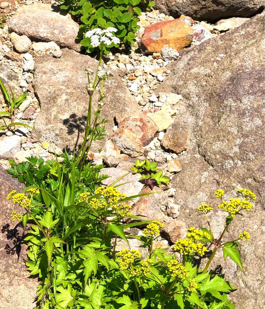 火山性の荒れた岩場にしっかりと根付いてます。白いのはセリ科のシラネニンジン、黄色いのはまだ蕾のコキンレイカですねえ😍