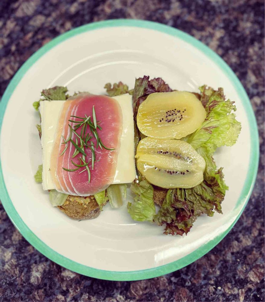 サニーレタス、黄色キウイ、とチーズ、生ハム、ローズマリーの簡単サンドイッチ。