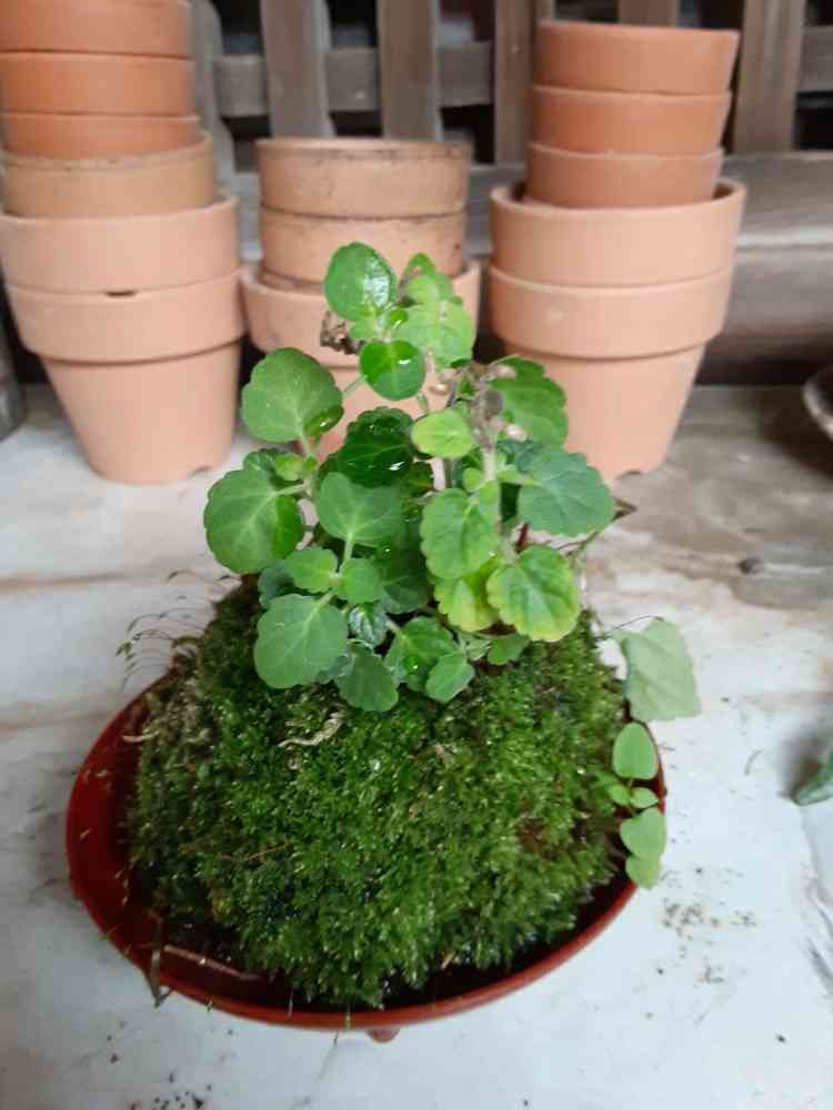 友だちと庭や山で見つけた植物を持ち寄って苔玉作りをしました。2か月たってなかなかいい感じに成長してます。しかし名前がわからない?教えてください‼️