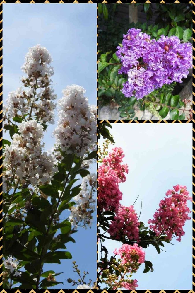 道すがら❗民家の庭先で見た青空に映える❗3色の🌼🏵️🌺🙉サルスベリの花🙉🌺🏵️🌼