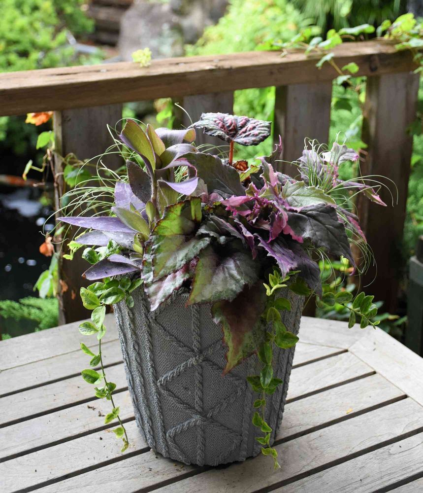 レックスベゴニア、ギヌラ、カレックス、ヒメツルニチニチソウ、ムラサキオモト