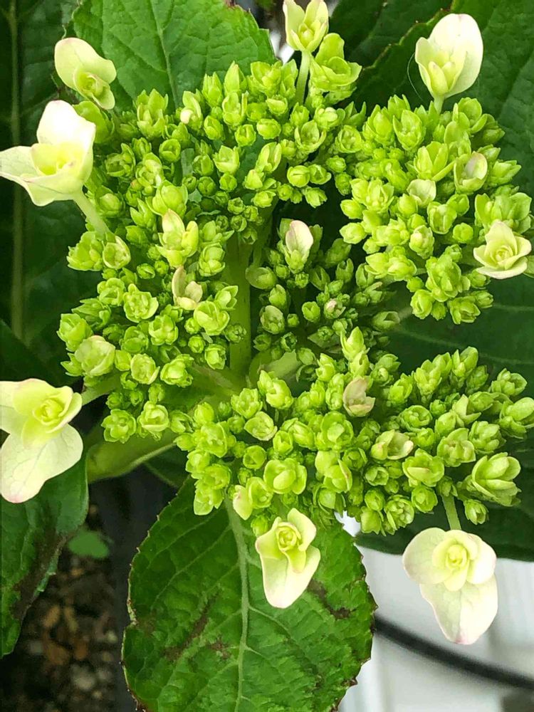 令和3年7月29日(木)曇り☁️ おはよー(๑・̑◡・̑๑)ございます 小さい庭の朝の見廻りしています。3月に満開✨🌸🌸🌸🌸でキレイ✨な紫陽花にヒトメボレ😍💕して買い求めた🙄花が茶色く枯れて剪定した筈が………花芽が上がってツボミ☺️ガクも開いて☺️あの時のピンク色に会えるでしょうか 🎶🎵♪