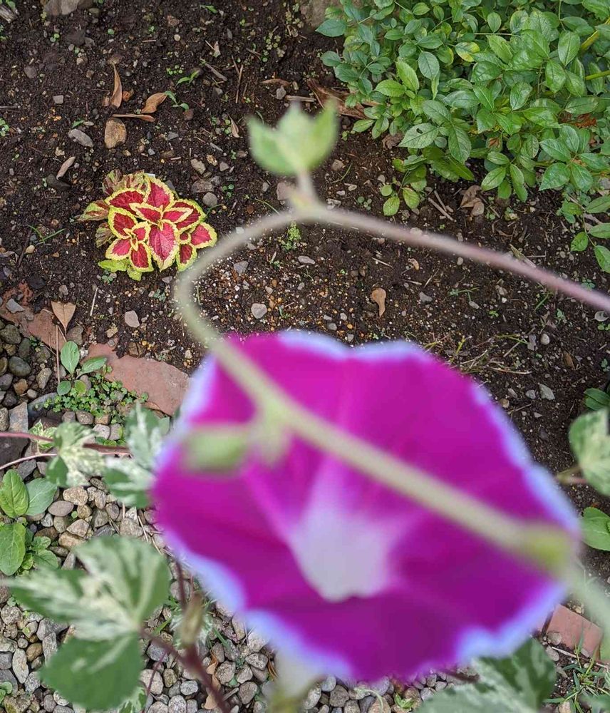 実は朝顔の蔦がとても伸びてヘタするとコリウスまて届きそうなんです。だから