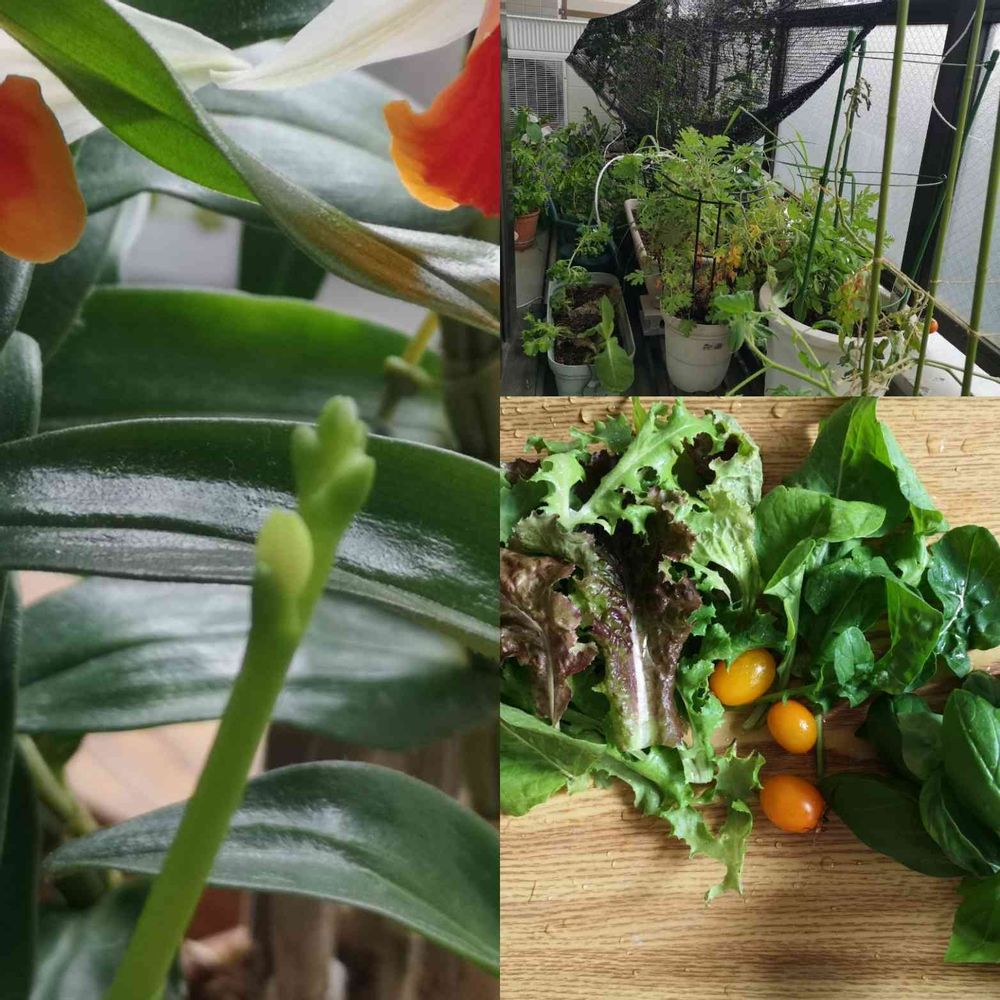 連日30度超えの中、5日間も家を開けてしまい、狭小ベランダガーデンが気がかりでしたが、みんな無事でした。遮光ネットの下、みんなギュット集まって助け合ってもらい、バラは鉢カバーで熱の吸収を抑え…。みんなよく頑張ったね。今朝から留守中の変化を観察した後、山に行くと不足しがちになる生野菜をたっぷり収穫。初の胡蝶蘭🔰は花芽がふっくらしてきました。咲くの楽しみ!