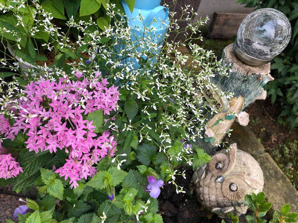 寄せ植えを頂いたので、花壇の主のフクロウと共に🎶