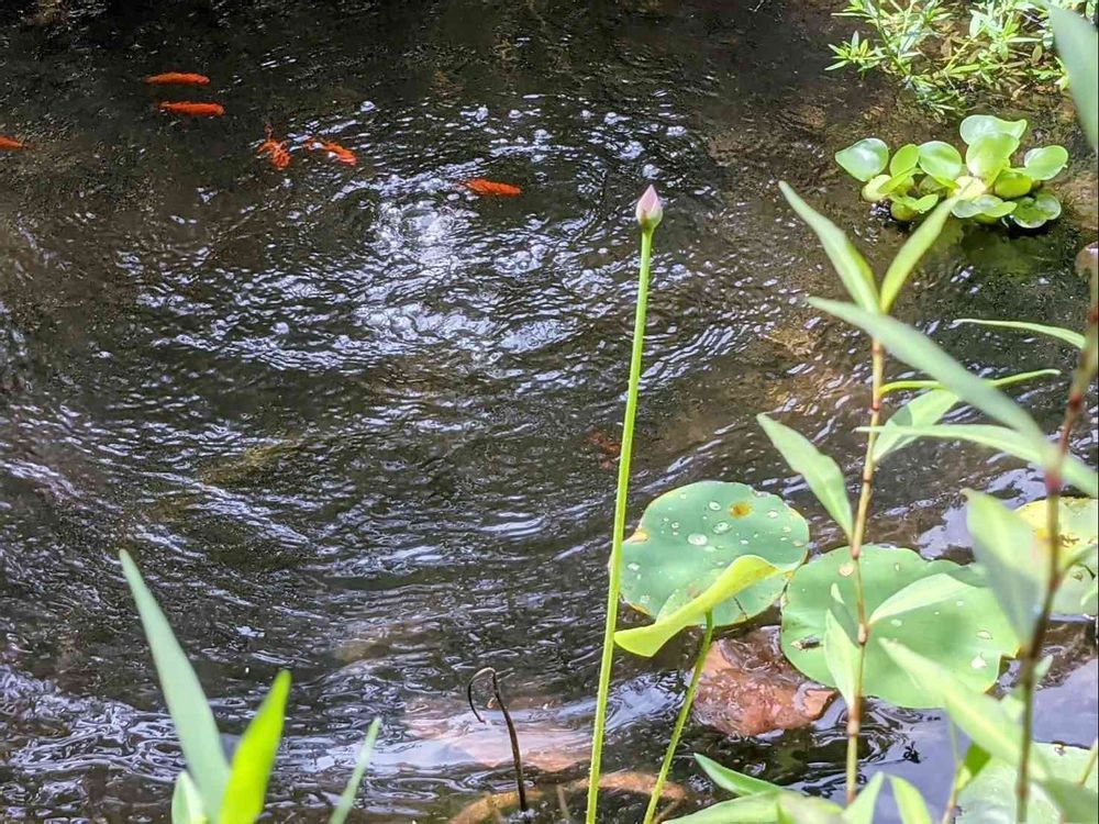 池の手乗り蓮「小舞妃」の2番花の花茎が随分伸びて来ました。1番花の2倍にもなろうかという勢いですが、又激しい雨の心配をしてしまいます。🎐