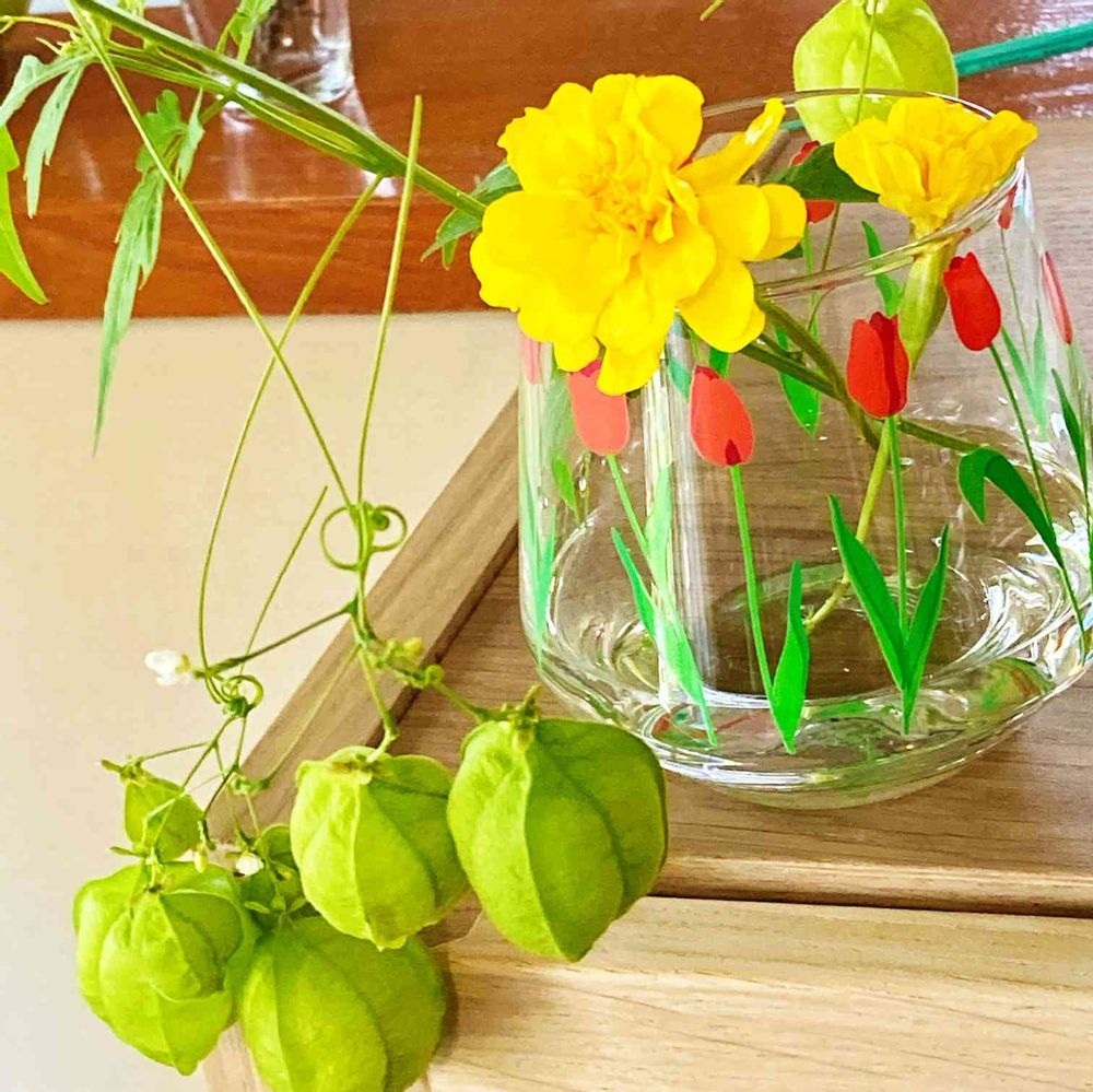 伸びすぎた風船かずらとナスの下で増えすぎたマリーゴールドを3coinsのグラスに。