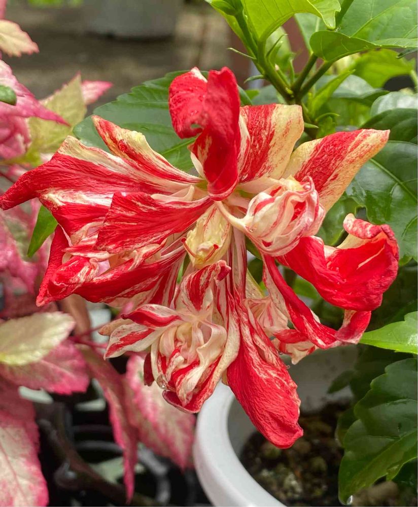 八重咲き、赤白絞りの、なんとも個性的で印象的なお花、ハイビスカスハワイアンフラッグさん💕
