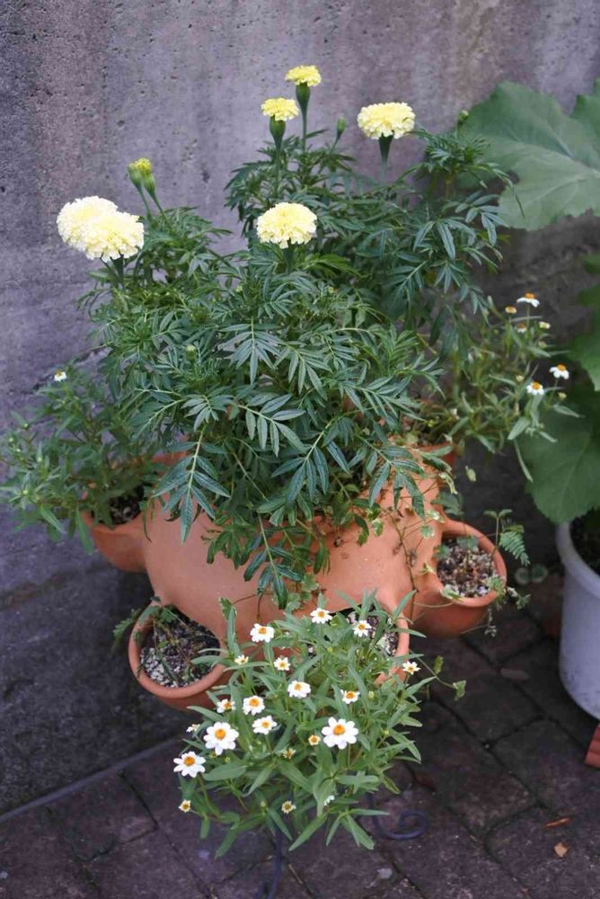ストロベリーポットに植えたアフリカンマリーゴールドとジニア・リネアリスがようやく咲き揃いました。暑いけど、頑張って!