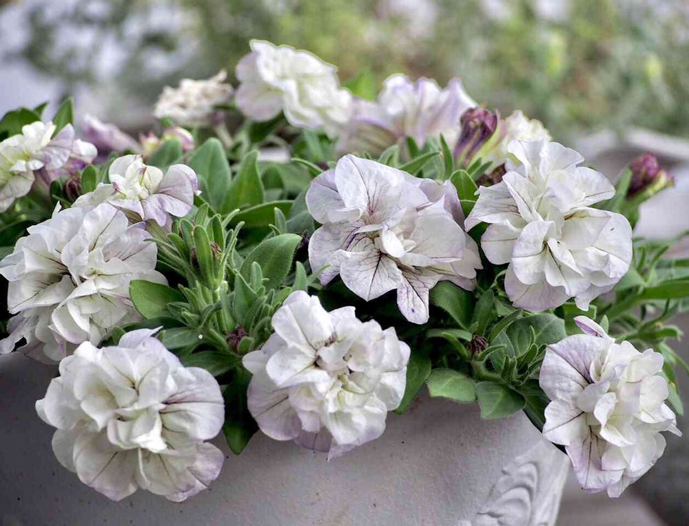 ホワイトの八重のお花に濃い紫のベイン(脈)が入っています。