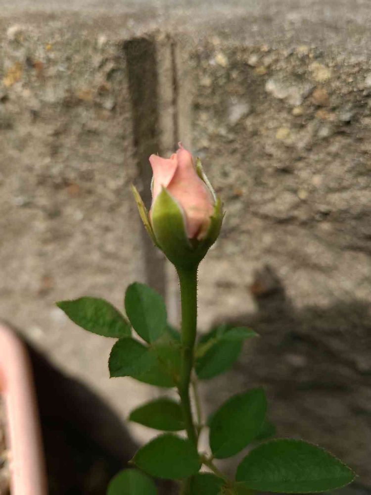 花壇に直接挿し木したミニバラです。二本が成長して花を咲かせるようになりました。未だ背丈は20センチにもなっていません。