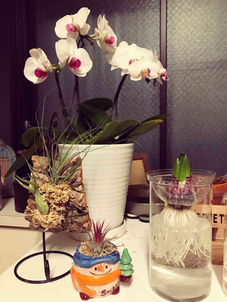 お花屋さんで処分品だった胡蝶蘭、ダイソーチラさん、ホームセンターチラさん、ホームセンターヒアシンスさん。