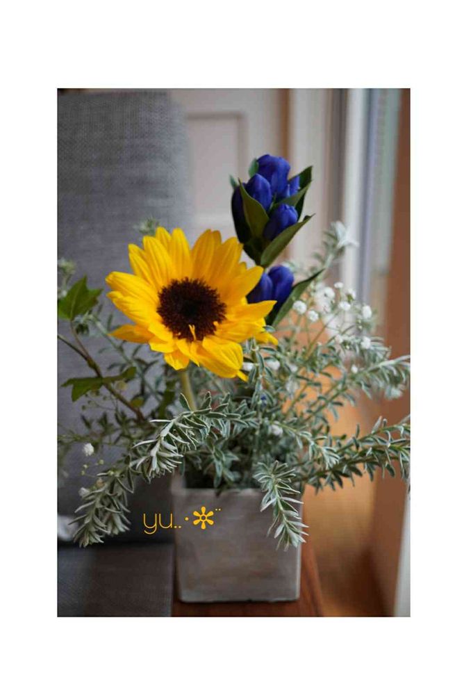 こんにちは🙂はじめまして。見てくださってありがとうございます。向日葵にリンドウ季節のお花🏵あってる💗こんな生け方好き❤︎です。フォローさせて頂きますよろしくお願いいたします(⑅•͈૦•͈⑅)☔ばかりの日々気をつけてお過ごしください❣️
