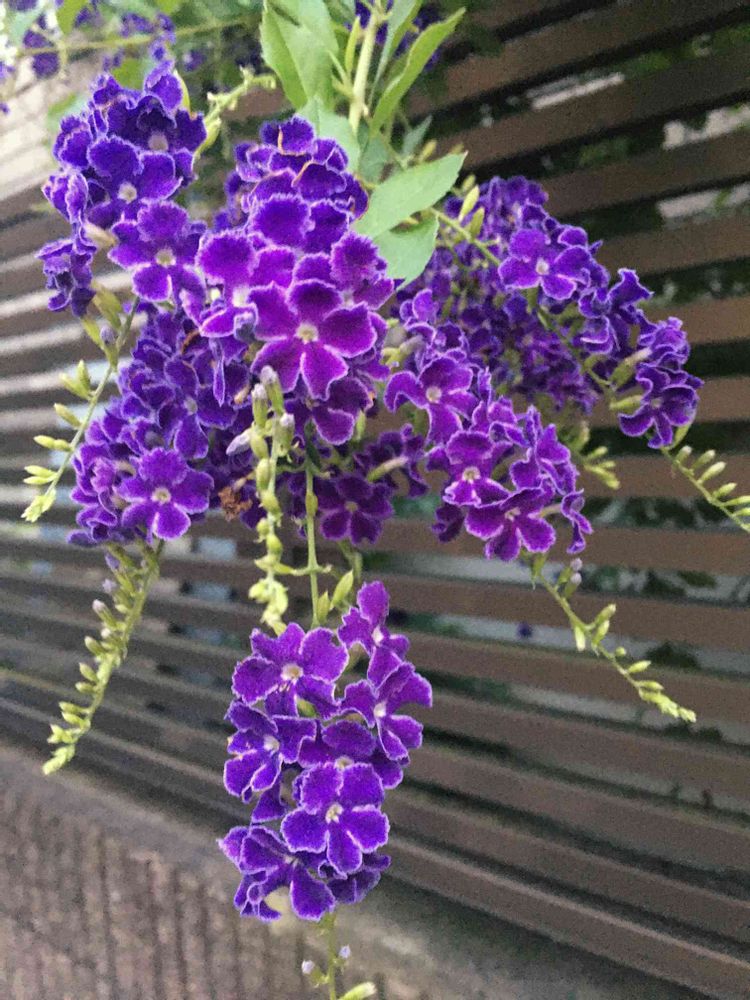紫色のデュランタ、垣根の外へお顔を出して、道を通る人達に