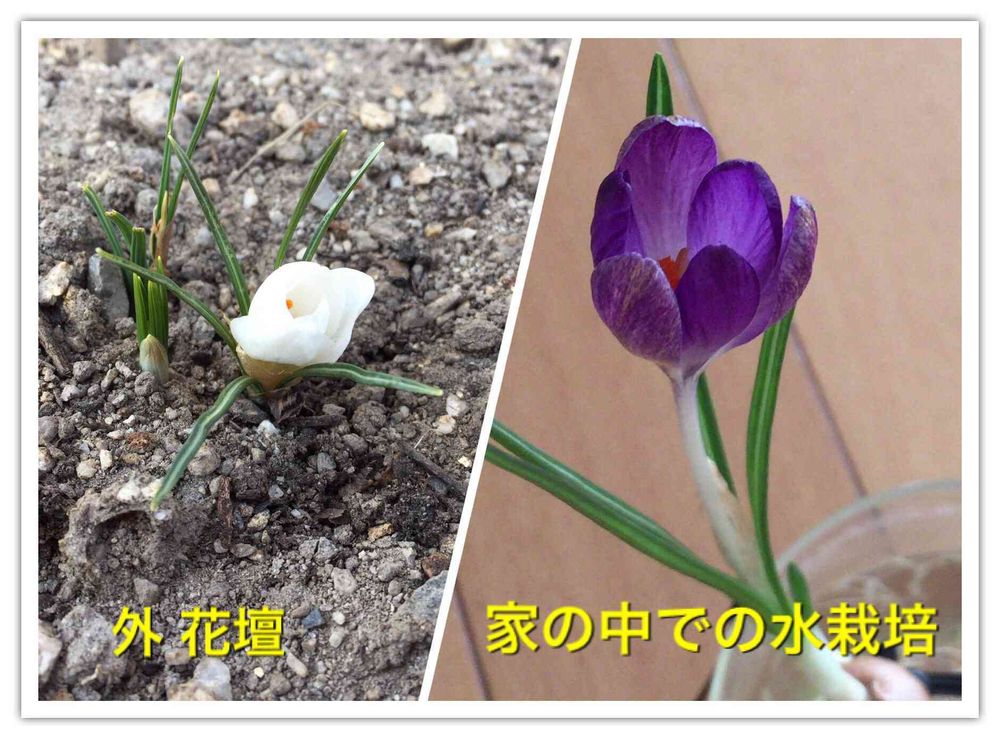 クロッカスが咲きました。水栽培と花壇とほぼ同じ日に花が咲きました〜。