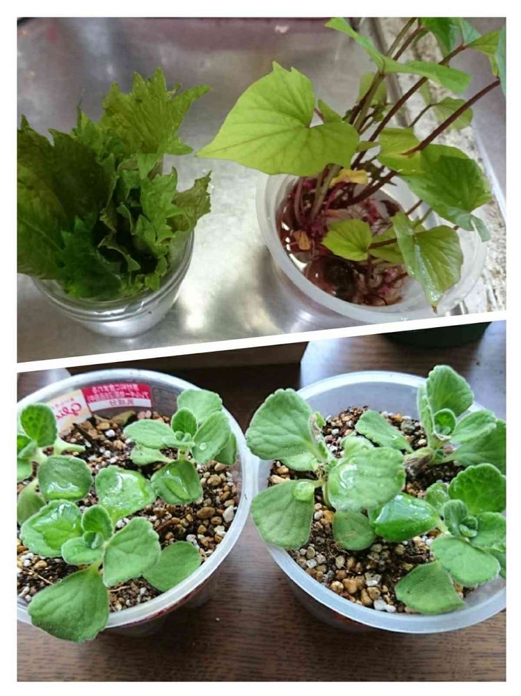 シソの葉はお水に挿しておくとかなり持ちます。そしていつもとりたてのようなみずみずしさです。その横は、さつまいもの葉。下はアロマティカスです。今年は色々に使ってみたいなぁ。