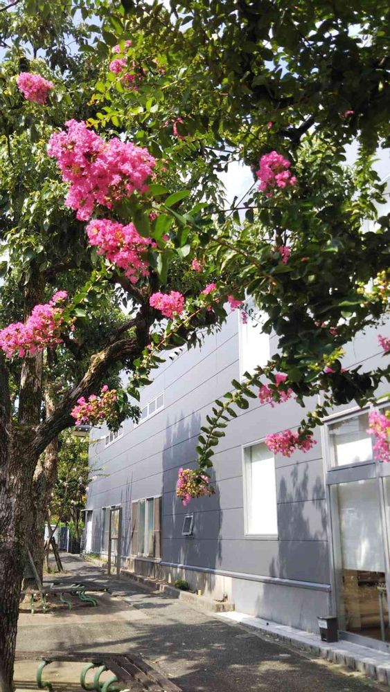 白のサルスベリの横に咲く濃いピンクのサルスベリです。花は盛りになると話しかけて来るようです。