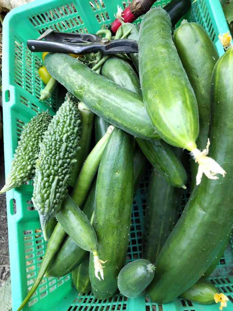 すご〜い収穫ねー ゴーヤもある キュウリはどんなお料理するの❓