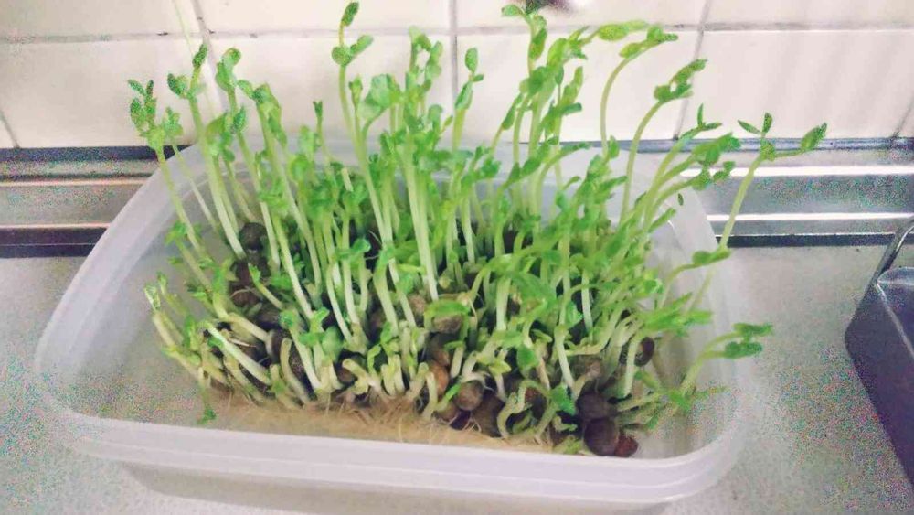 豆苗を食べ終わり、根っこの所を残して、水をあげたら、みるみる生えてきました。ハーブ(?)ですが、可愛らしいので投稿しました。