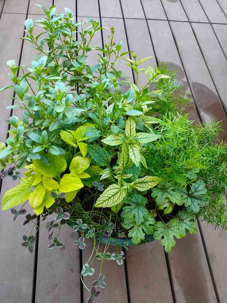 みどりの寄せ植えになっちゃった~。ま、これも良いよね??唯一、ひっそり左側に:『オレガノ』が咲いてるけど…見えないね…💦