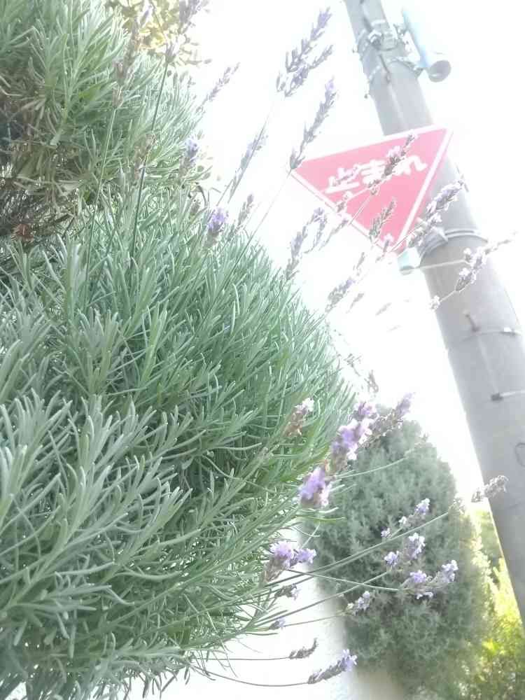 お家の塀から垂れ下がるように咲いてるラベンダー
