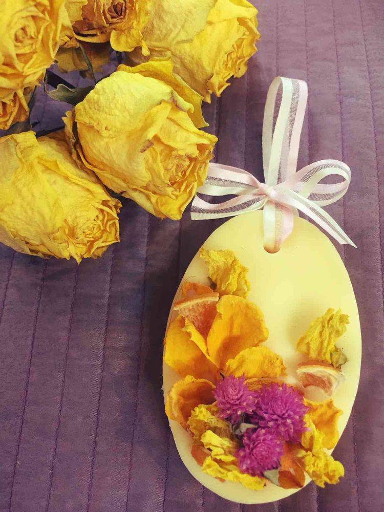 黄色のアロマワックスバー。アクセントにちょうどいいバラが見つからず千日紅にしました。ドライスイトピーも使っています。香りはレモングラスにしています。(^-^)
