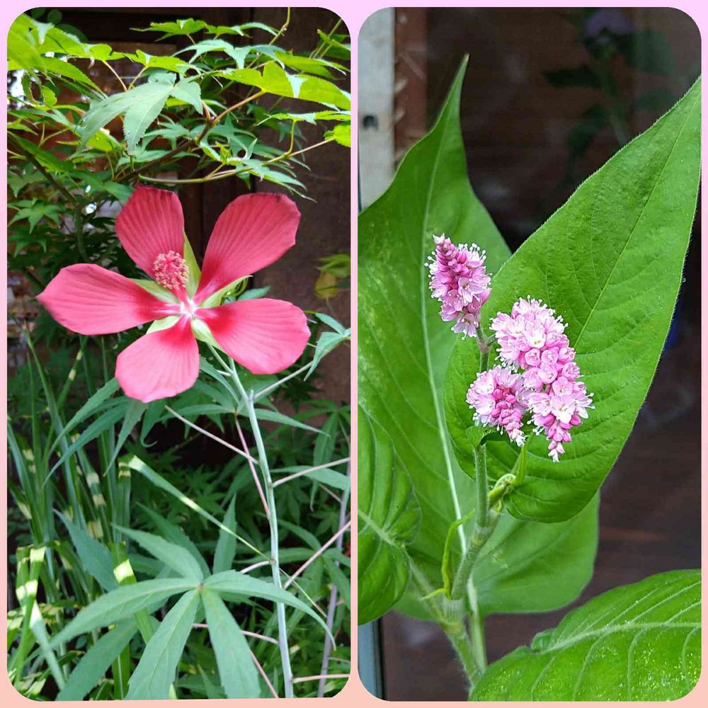 人気甘味処前に咲いていた💗モミジアオイ💗と、右側のお花はタデでしょうか🤔