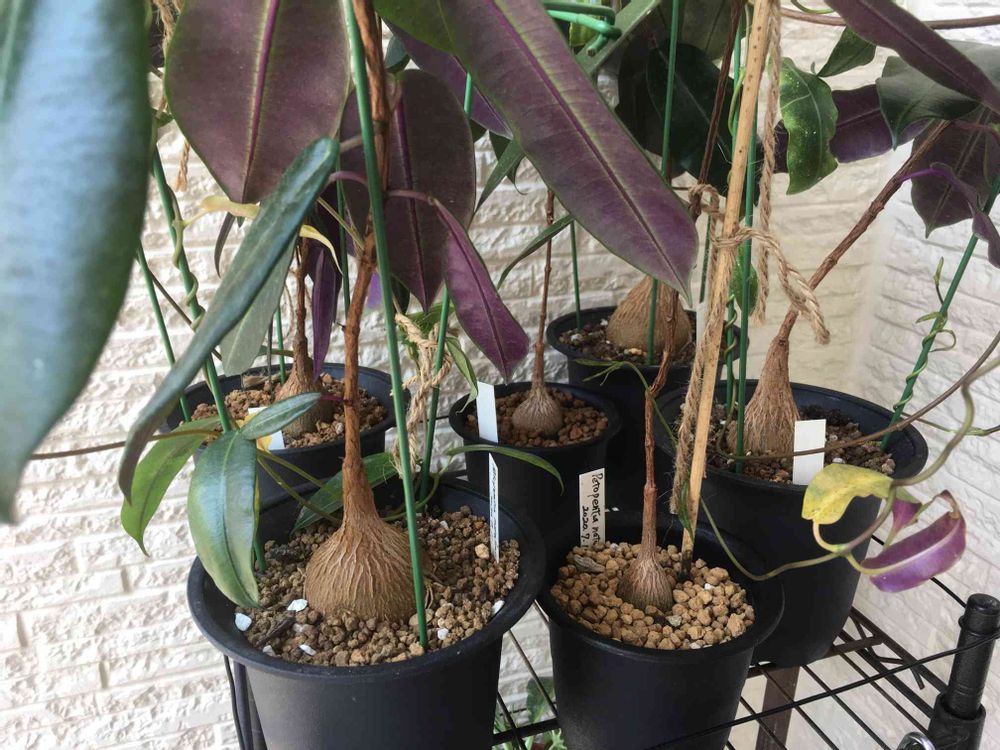 塊根の大きさがマチマチですが、6鉢あります。半日陰で育てていますが、最近は専らハダニとの闘いです。