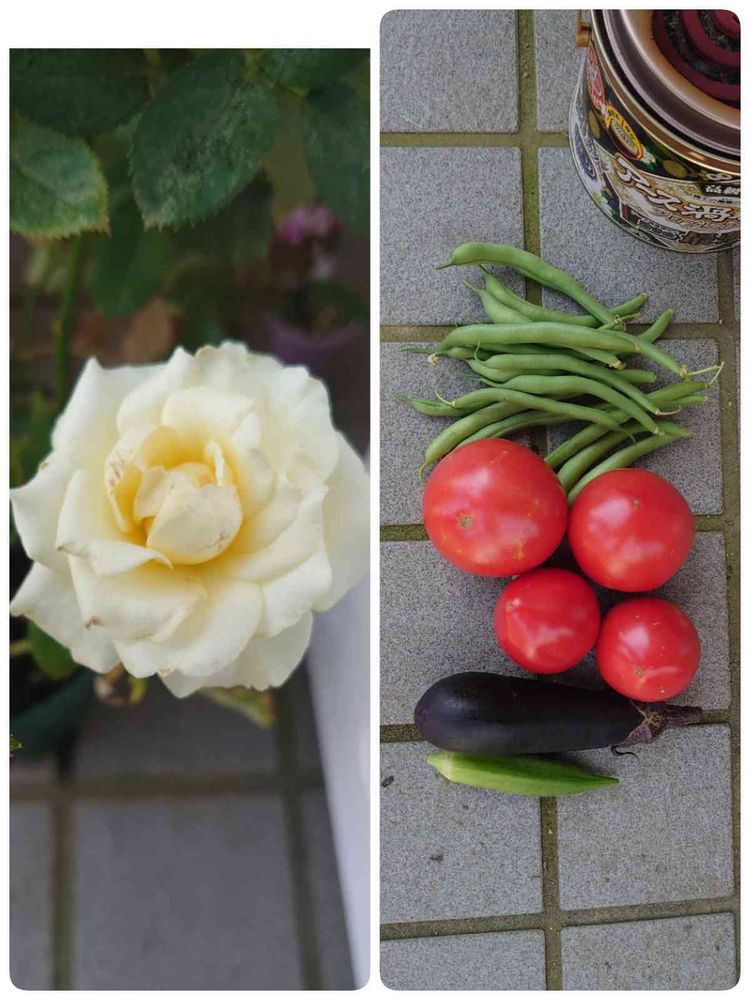 小さな庭,ミニ 薔薇,インゲン、トマト、茄子、オクラの投稿画像