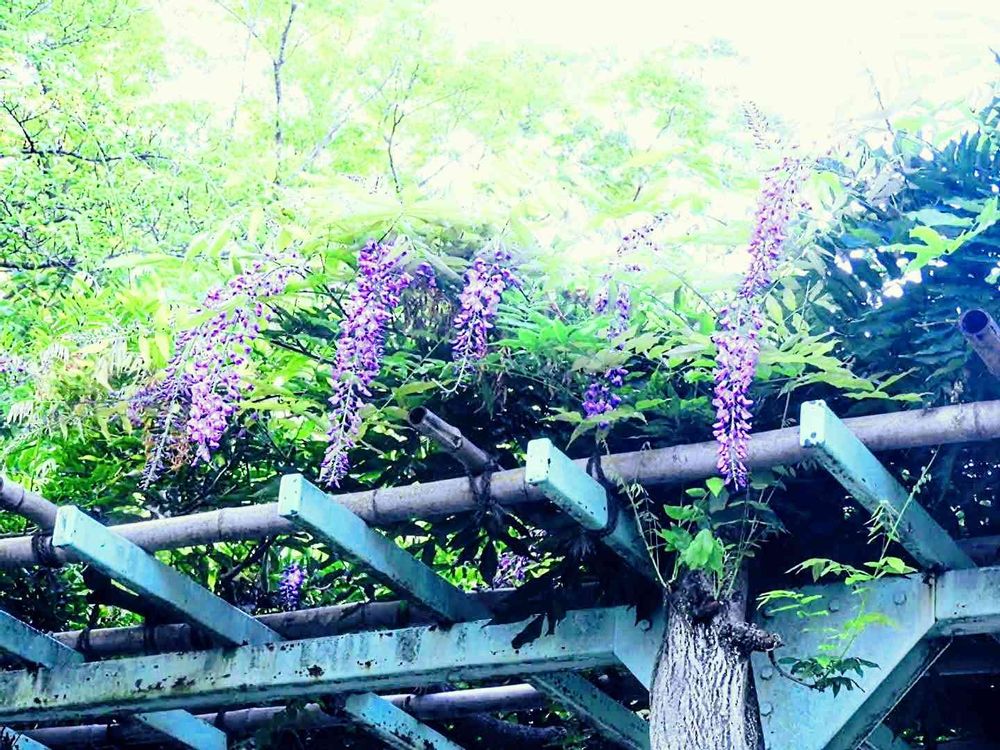朝採れ野菜を買いに行く途中、熊野神社隣熊野公園の藤棚に、狂い咲きなのか、藤の花が咲いています。