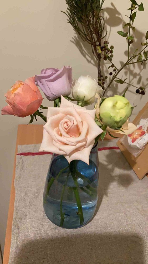 黄色以外と 違うところに飾ってるバラ5本で500円と破格でした・:* ೫̥♡*