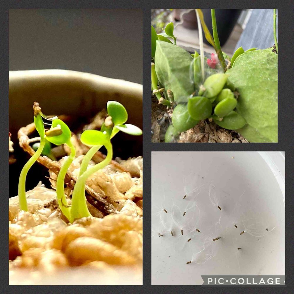 サヤが弾けて綿毛の付いた種が沢山採れました。水苔に蒔いておいたら1日で発芽。1週間後の今日は双葉になっています。