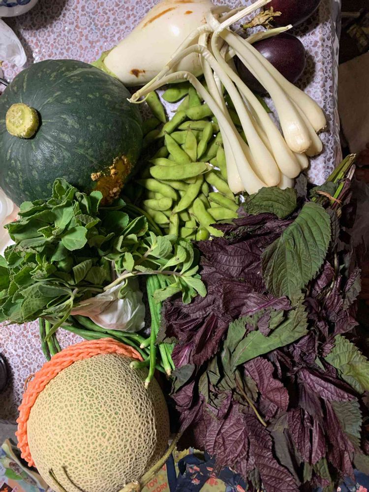 沢山のお野菜💕南京、白ナス、エシャロット、パッションフルーツ、枝豆、赤紫蘇、ササゲ、マンジェリコン、メロン