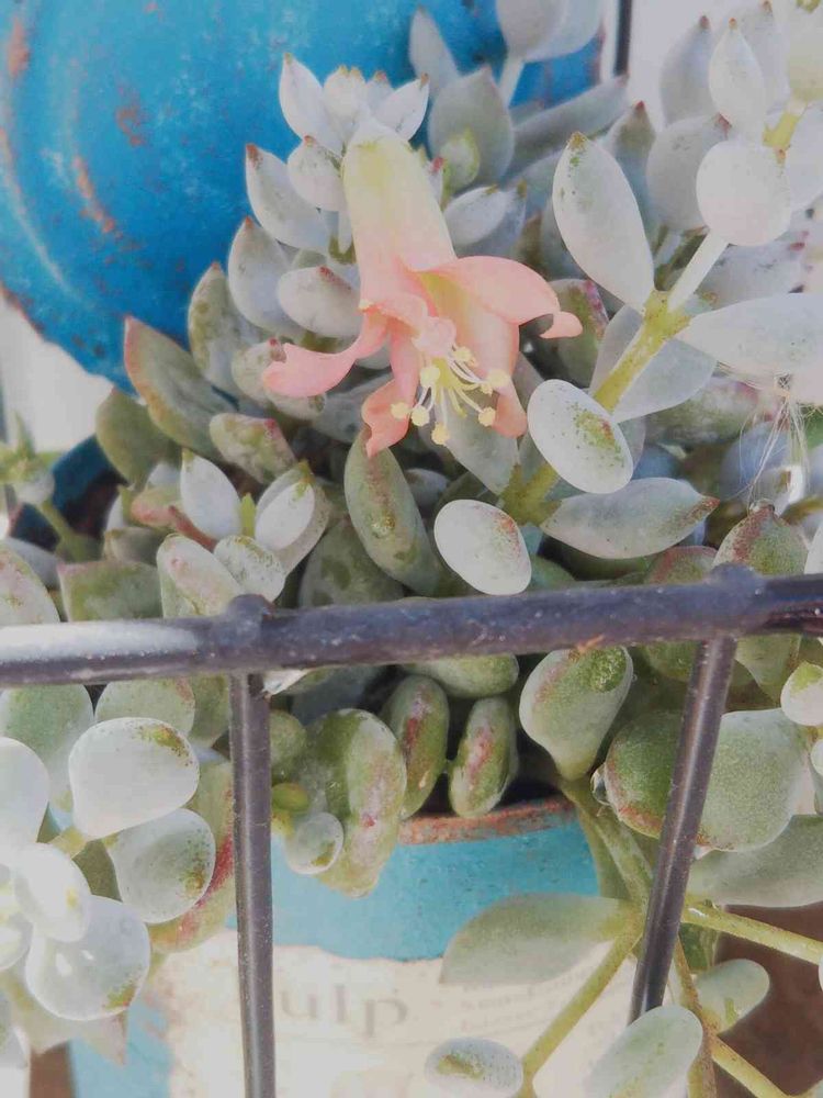 多肉さんのペンデンスにかわいい花が咲きました。葉に埋もれる感じで咲いていたので、見逃してしまいそうでした。
