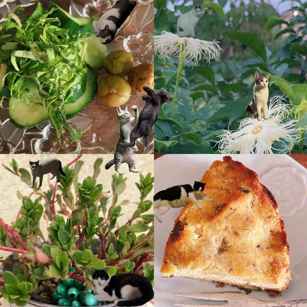 手前のお花にはミーちゃん、奥にはオチビちゃんが乗っています。